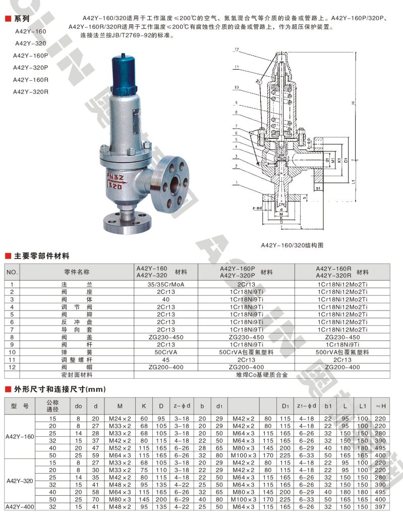 A42Y-160/320適用于工作溫度≤200℃的空氣、氨氫混合氣等介質(zhì)的設(shè)備或管路上。A42Y-160P/320P、A42Y-160R/320R適用于工作溫度<200℃有腐蝕性介質(zhì)的設(shè)備或管路上,作為超壓保護裝置。