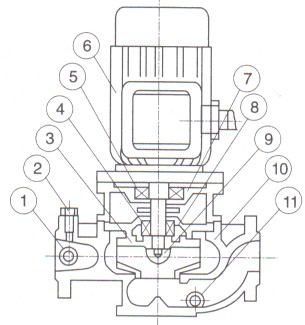 | 7、聯(lián)體座 | 8、泵蓋 | 9、葉輪螺母 | 10、泵體 | 11、放水閥 |
