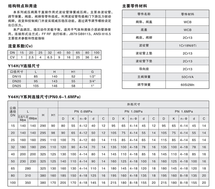本系列減壓閥屬于直接作用式波紋管彈簧減壓閥。主要由波紋管、調節彈簧、閥座、閥瓣等零件組成,利用波紋管傳感閥門下游壓力驅動閥瓣,改變和控制閥門開度實現減壓穩壓功能。通過調節調節螺栓設定出口壓力。